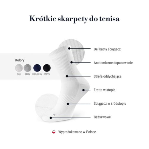 Skarpety sportowe z kolekcji sportowej to wysokiej klasy produkt, który został starannie zaprojektowany z myślą o wymagających sportowcach oraz entuzjastach aktywności fizycznej. Ich uniwersalny charakter sprawia, że są idealnym wyborem zarówno dla początkujących, jak i zaawansowanych graczy tenisa, squasha czy innych dyscyplin wymagających precyzyjnego i komfortowego wsparcia stóp. Dzięki zastosowaniu nowoczesnych technologii i wysokiej jakości materiałów, te skarpety zapewniają optymalny komfort, trwałość i funkcjonalność, które sprawią, że każda aktywność sportowa stanie się jeszcze przyjemniejsza i bezpieczniejsza.