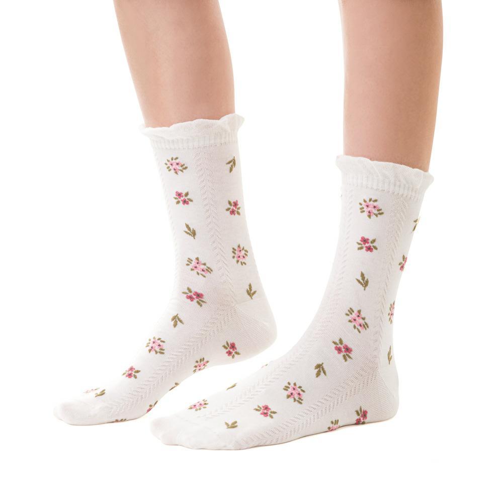 Prezentowane skarpetki zachwycają swoim delikatnym, kwiatowym wzorem, który został starannie opracowany, aby dodać każdej stylizacji romantycznego charakteru. Motyw kwiatków, inspirowany niezwykłym bogactwem i różnorodnością flory, odzwierciedla naturalne piękno i zmienność otaczającego świata. Wzór jest subtelny, elegancki i zarazem pełen świeżości, co czyni je wyjątkowym dodatkiem na co dzień, zarówno do stylizacji casualowych, jak i tych bardziej eleganckich.
