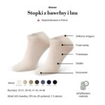 Największym atutem produktu jest jego skład, oparty na wysokiej jakości włóknach naturalnych. Bawełna, stanowiąca 65% materiału, odpowiada za miękkość oraz przyjemne uczucie podczas noszenia. Jest to materiał oddychający, który skutecznie pochłania wilgoć i pomaga utrzymać stopę w suchości przez cały dzień. Dodatek 25% lnu sprawia, że stopki zyskują jeszcze lepsze właściwości termoregulacyjne. Len to włókno cenione za swoją przewiewność oraz zdolność do chłodzenia, dzięki czemu idealnie sprawdza się w okresie letnim, zapewniając uczucie świeżości nawet podczas wysokich temperatur.